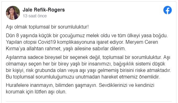 “Dün 8 yaşında küçük bir çocuğumuz melek oldu ve tüm ülkeyi yasa boğdu. Yapılan otopsi Covid19 komplikasyonuna işaret ediyor. Meryem Ceren Kırma’ya Allah’tan rahmet, yaslı ailesine sabırlar dilerim. Aşılanma sadece bireysel bir seçenek değil, toplumsal bir sorumluluktur. Aşı olmamayı seçen her bir birey yaşlı bir insanımızı, bağışıklık sistemi düşük bir kişiyi, risk grubunda olan veya aşı yaşı gelmemiş birisini riske atmaktadır. Bu toplumsal sorumluluğumuzu unutmadan hareket etmemiz önemlidir. Hurafelere inanmayın, bilimden şaşmayın. Sevdiklerinizi ve kendinizi korumak için lütfen aşı olun.”