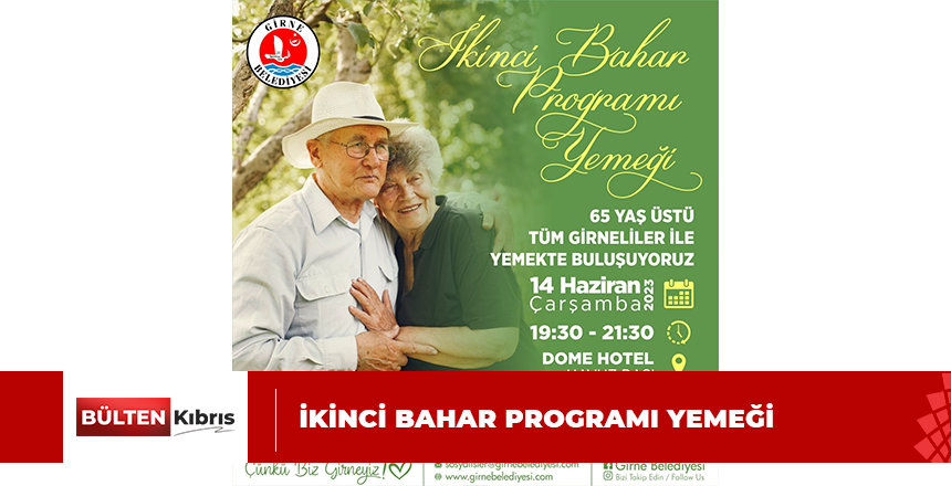 Girne Belediyesi İkinci Bahar Programı kapsamında 14 Haziran Çarşamba günü Dome Hotel’de havuz başında 65 yaş üstü bireyler için yemek düzenleyecek. Girne bölge sınırları içerisinde ikamet eden ...